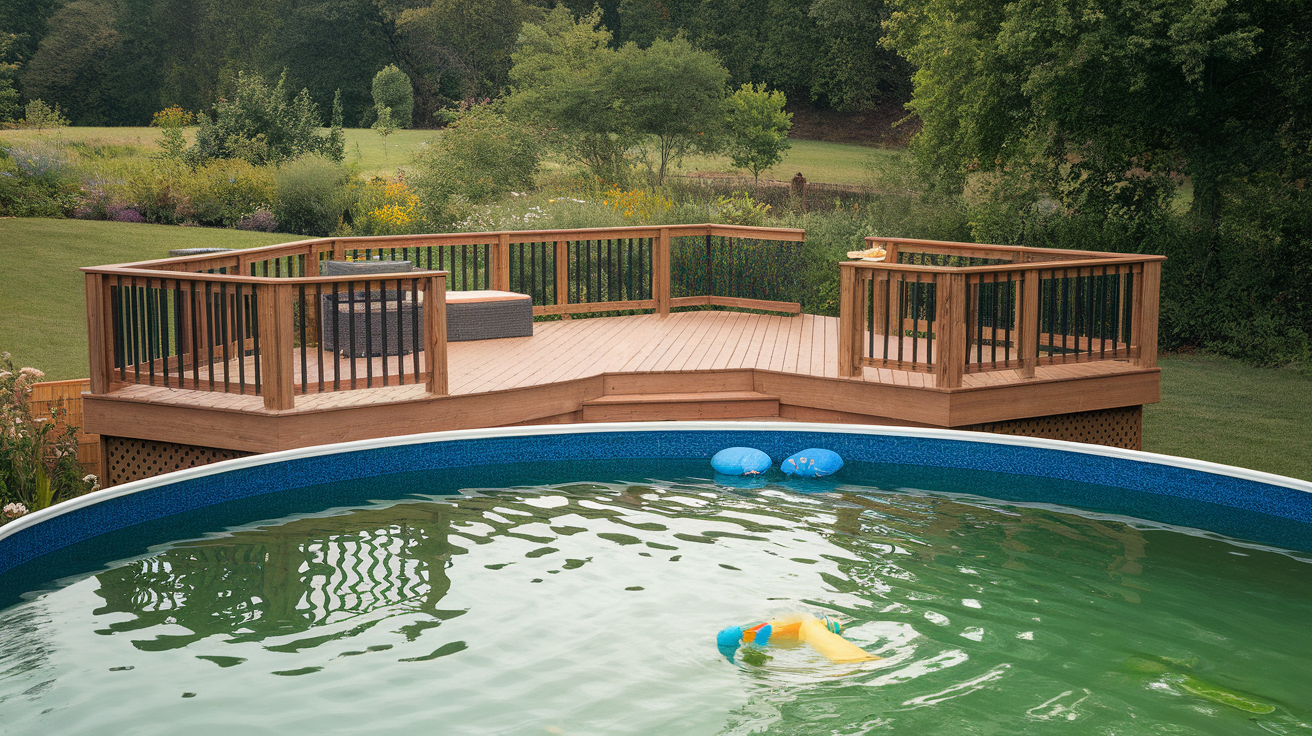 Try an L-shaped deck for above ground pools that need space efficiency. It gives you lounging area without overwhelming the yard.