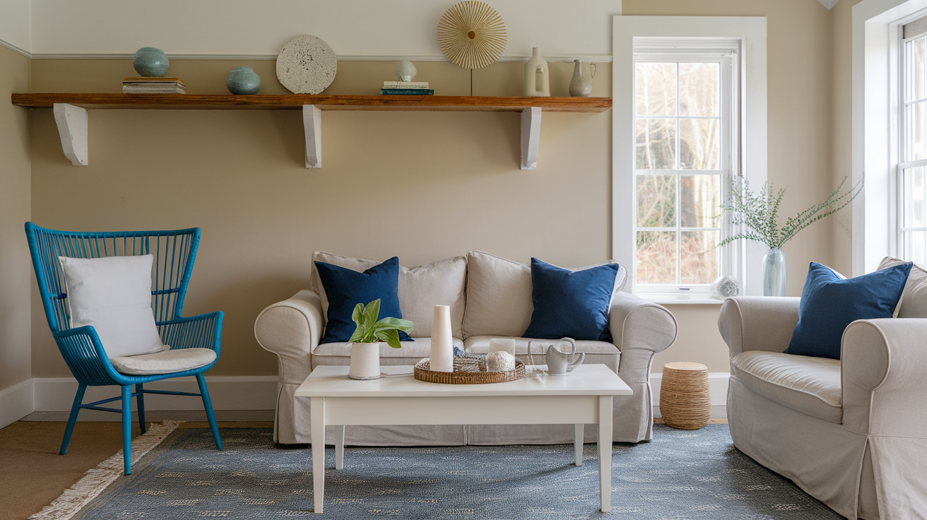 Fill walls with books, trinkets, and baskets. Cottage living rooms love collections—it makes the space feel lived-in.