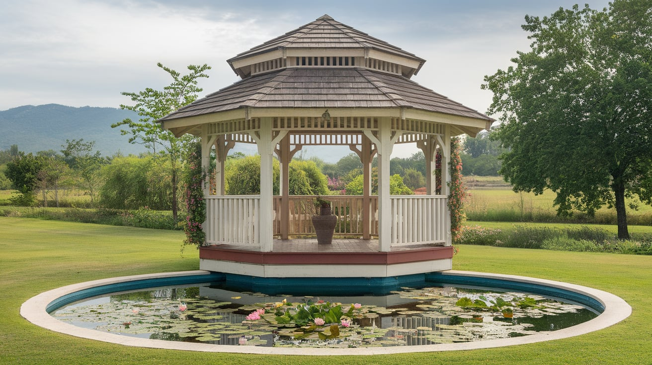 If you love vintage charm, a Victorian gazebo with ornate details and railings brings pure elegance.