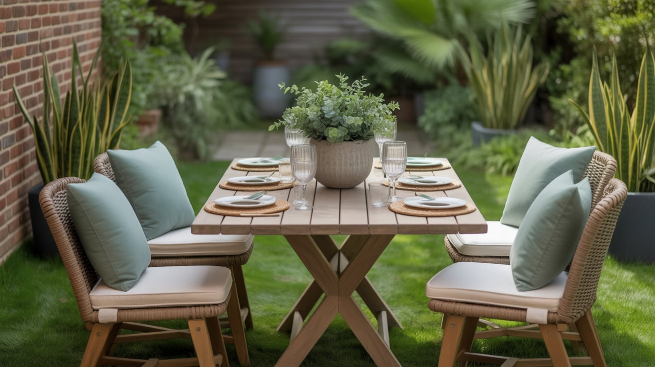 Comfortable seat cushions in neutral or patterned fabrics make outdoor dining more inviting.